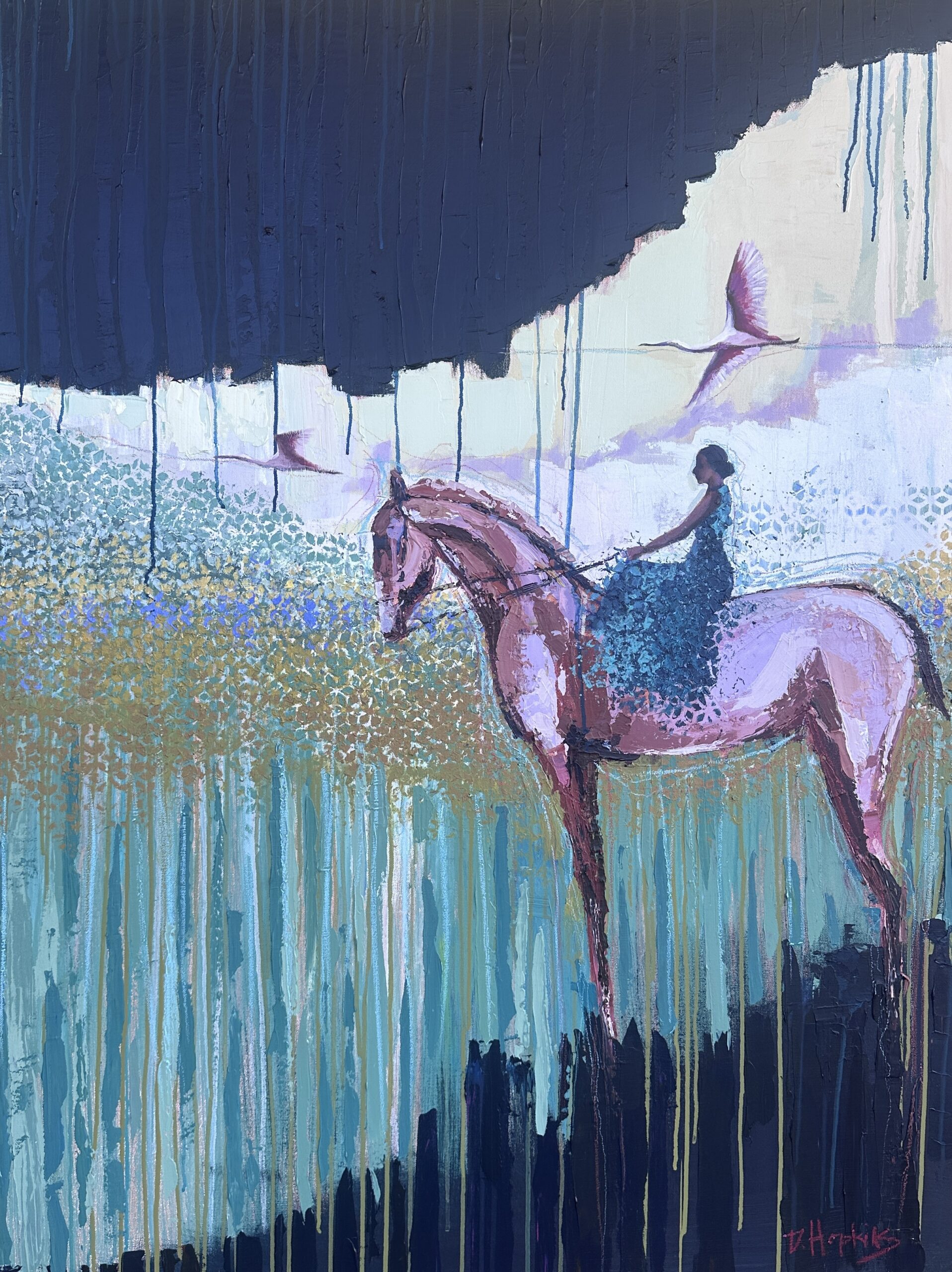 Riding Into the Unknown is an expressive abstract painting featuring a horse and rider moving forward beneath a dramatic sky, accompanied by birds as symbols of guidance and hope. Layered textures, drips, and marks evoke motion, trust, and the act of creating amid uncertainty.