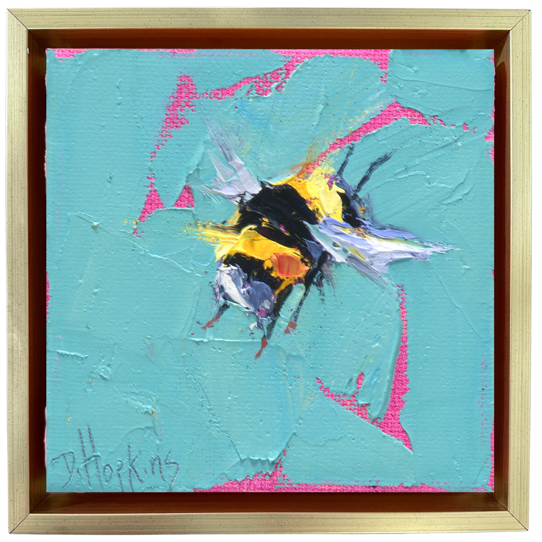 “Chasing the Buzz” is 4×4 inches on a gallery wrapped canvas that is 1.5 inches deep. It is created with oil and palette knives.  The painting comes in a gold floater frame, making it ready to hang upon delivery.