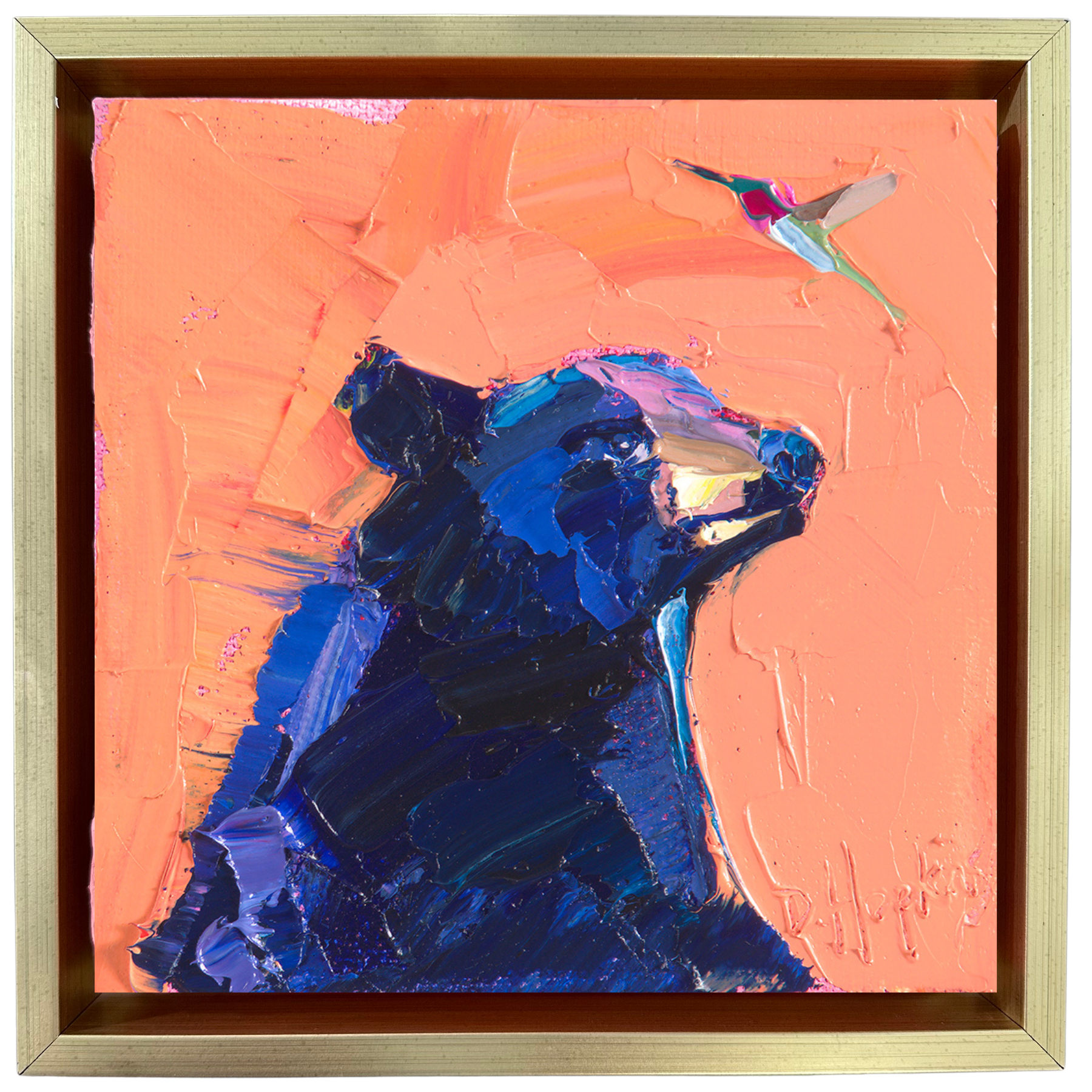 “Fight or Flight” is 4×4 inches on a gallery wrapped canvas that is 1.5 inches deep. It is created with oil and palette knives and featured a black bear and hummingbird. The painting comes in a gold floater frame, making it ready to hang upon delivery.