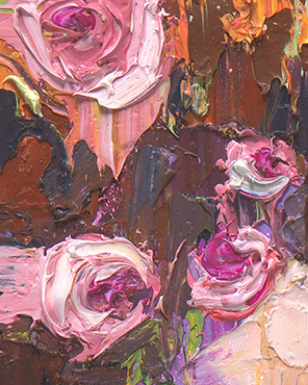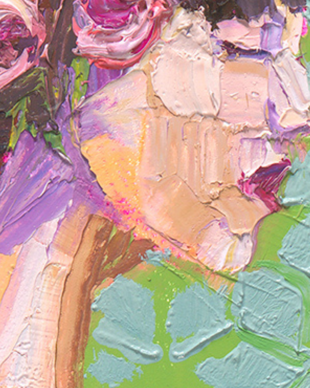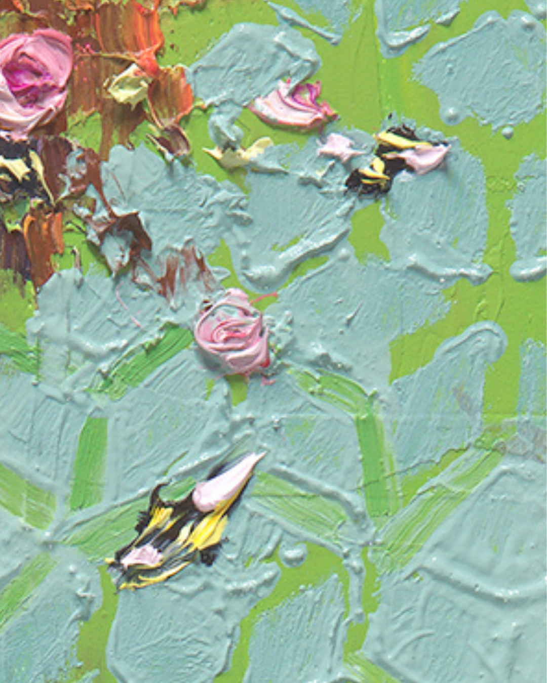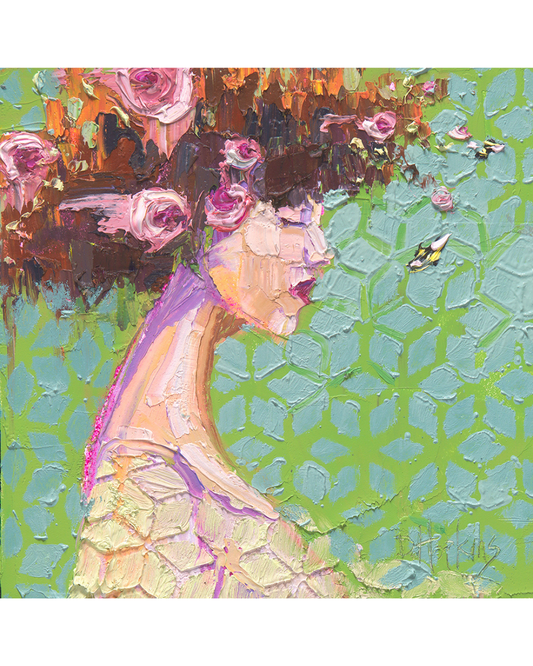 “Being Where I Am” is an original 6 × 6 inch impasto portrait painting with bees, created in oil using palette knives on a 0.25-inch–deep panel. Thick, expressive texture and layered color give the surface a tactile presence, inviting the viewer to slow down and linger with the work.