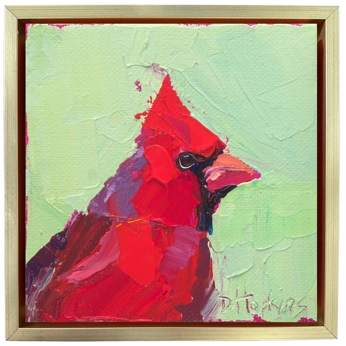 Getting Warmer is an original 4 × 4 inch acrylic cardinal painting, created with heavy-body acrylics on a 1.25-inch canvas. Built with a palette knife, the surface holds visible layers of paint, allowing texture and movement to play an active role in the composition.