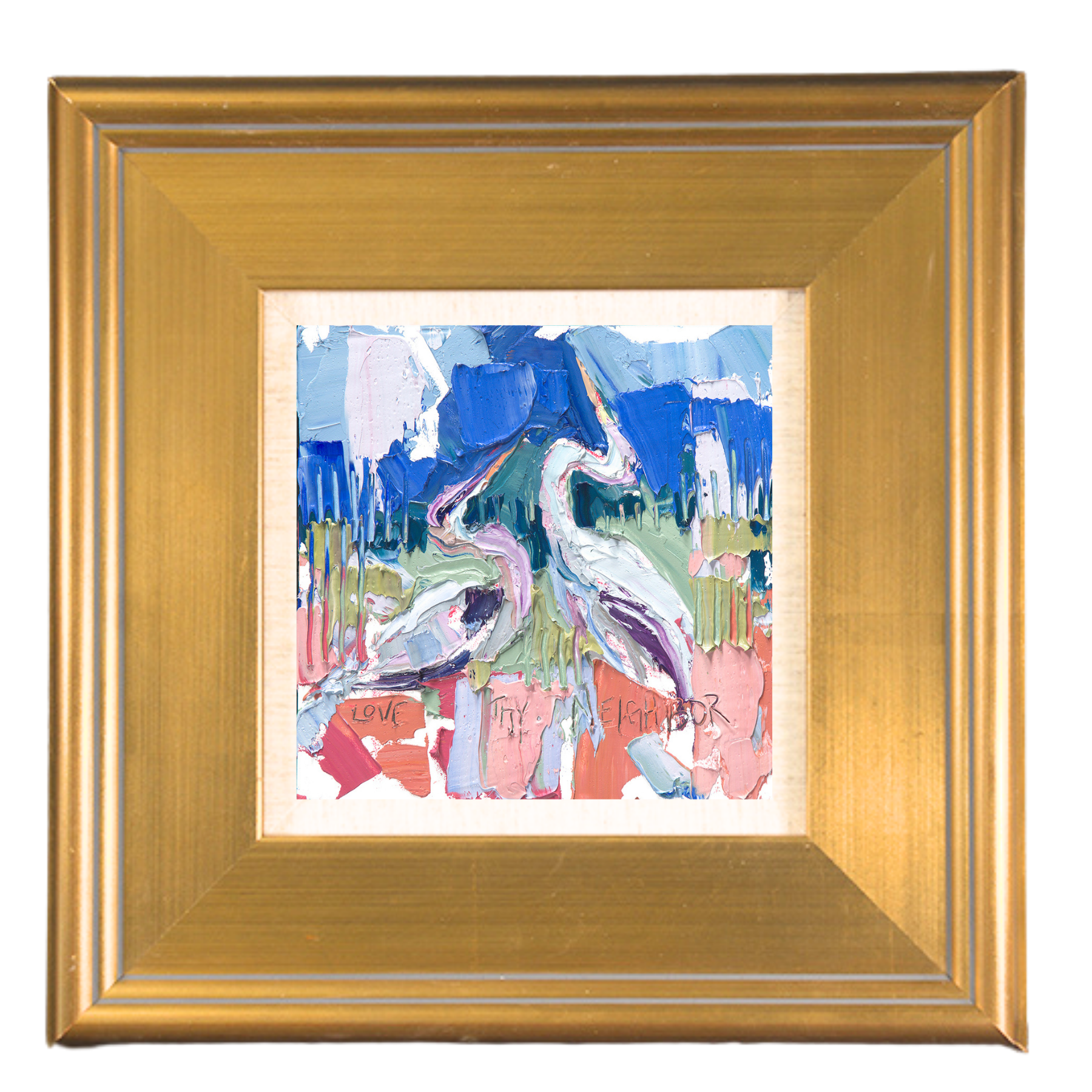 Scratched into the paint are the words “Love Thy Neighbor,” a phrase that became central to the making of this piece. As I worked, I was thinking about the parable of the Good Samaritan and Mary Oliver’s poem Franz Marc’s Blue Horses—both pointing toward mercy, imagination, and the quiet hope that beauty can make us kinder.