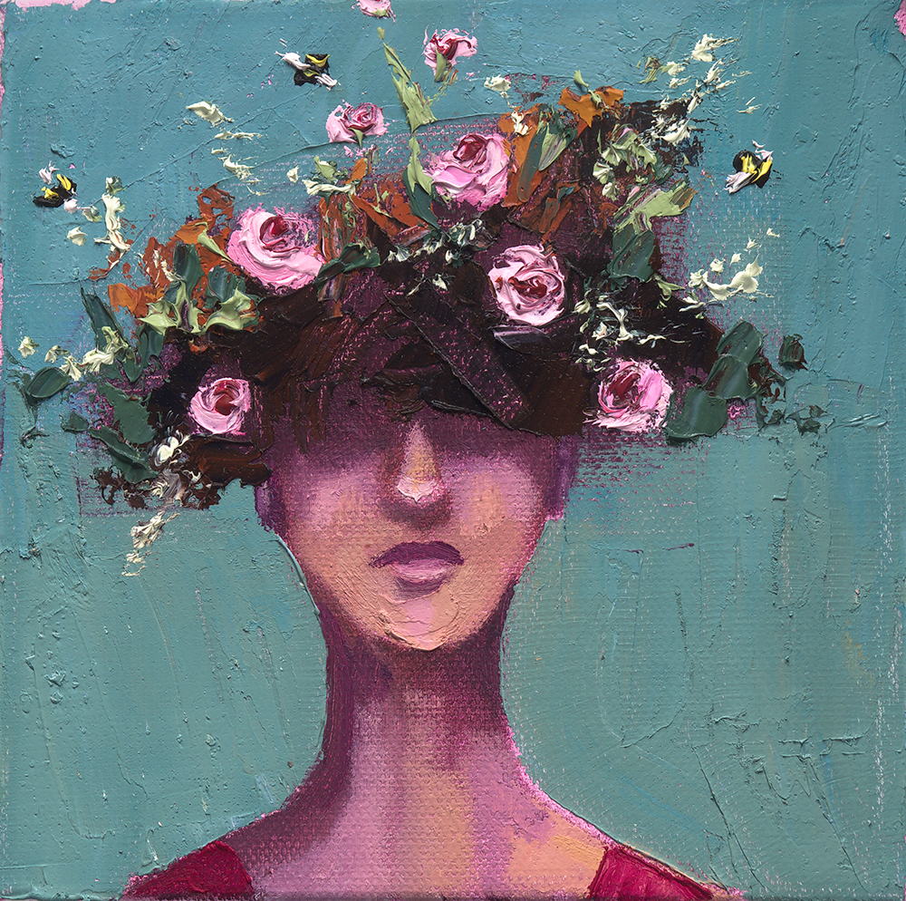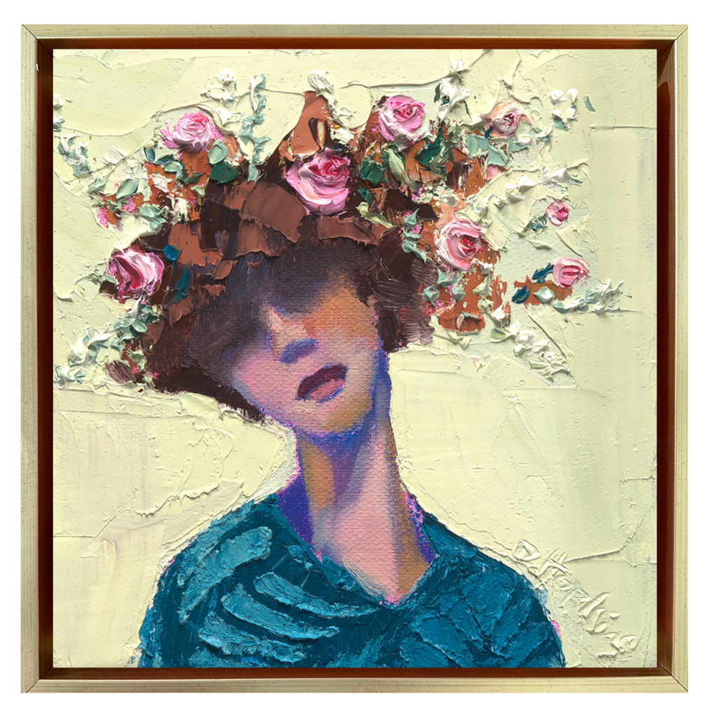 “Fresh Perspective” is a 6×6 canvas that is 1.5 inches deep. It is created with oil and palette knives. The painting is ready to hang in a gold floater frame.