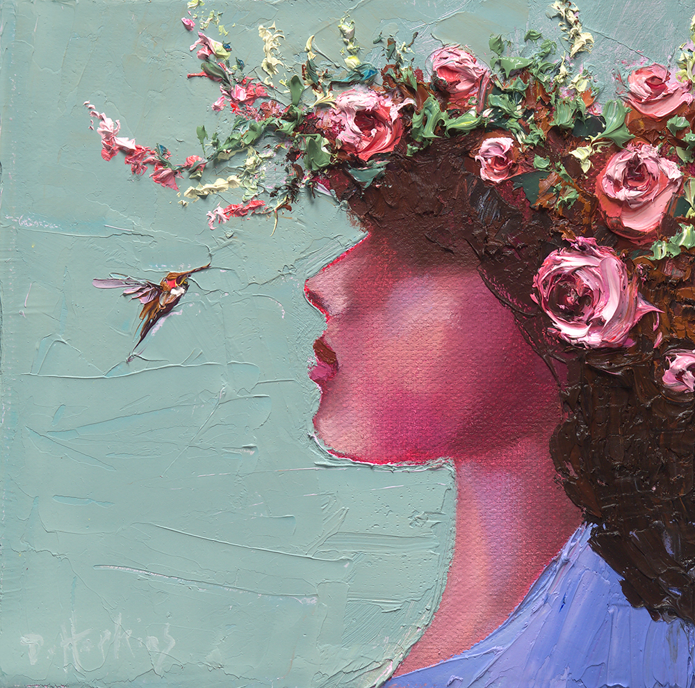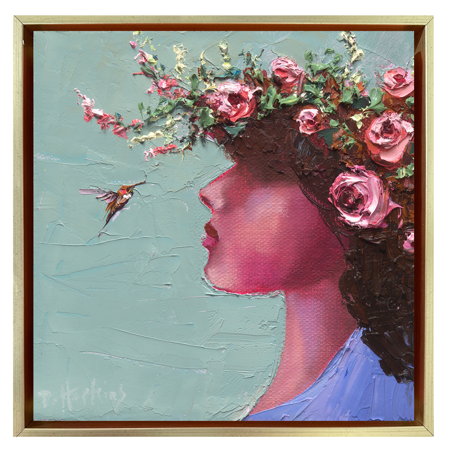 “Getting Closer” is a 6×6 canvas that is 1.5 inches deep. It is created with oil and palette knives. The painting is ready to hang in a gold floater frame.