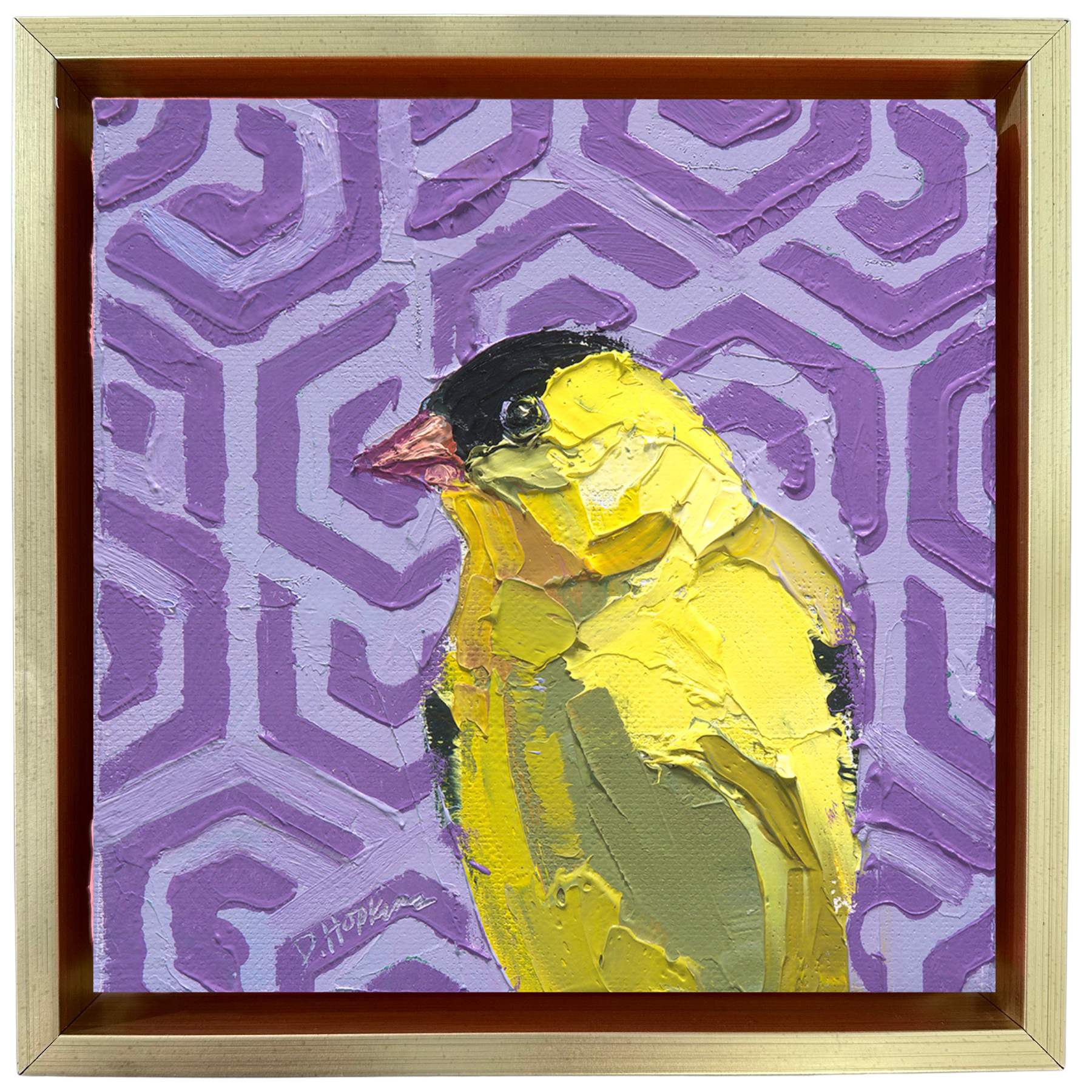 “Goldfinch Dreams” is 6×6 inches on a gallery wrapped canvas that is 1.5 inches deep. It is created with oil and palette knives. The painting comes in a gold floater frame, making it ready to hang upon delivery.