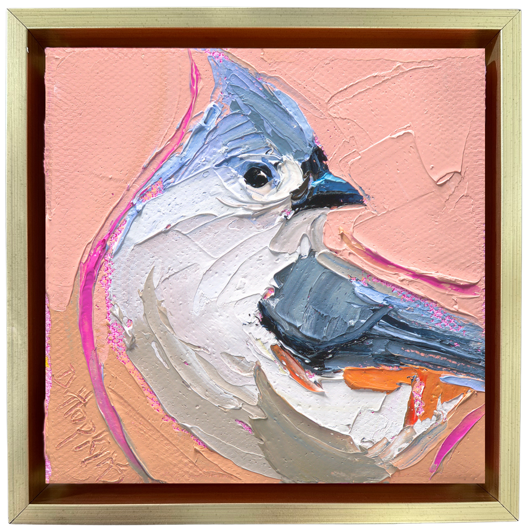 “Visit Here Anytime” is 4×4 inches on a gallery wrapped canvas that is 1.5 inches deep. It is created with oil and palette knives. The painting comes in a gold floater frame, making it ready to hang upon delivery.